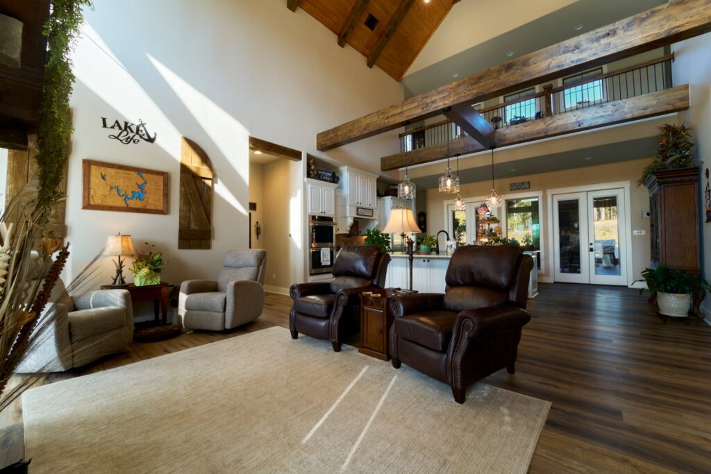 The center of the home rises through a full double height — twenty-four feet at the peak of the vaulted ceiling, crossed by massive timber beams that give the space its mountain-lodge weight. The great room below is open, warm, and grounded: leather seating, wood floors, a stone fireplace, and windows on two sides pulling in the western light. Above, a catwalk bridges the two wings of the house, connecting the bedrooms on one side to the game room on the other.