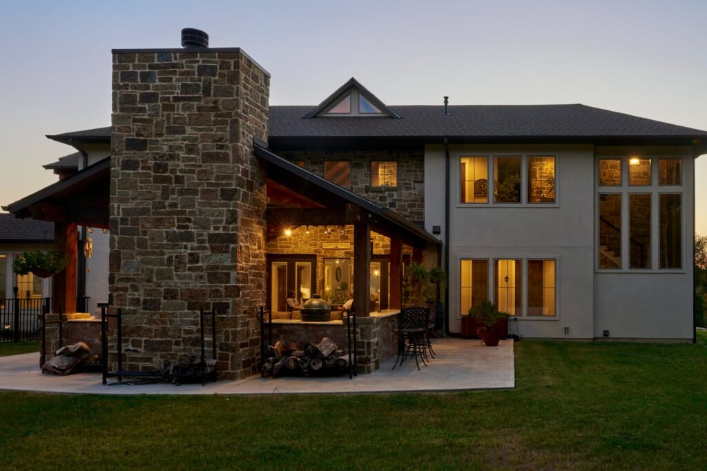 On the rear of the home, the team chose to put the stone inside rather than outside — so the owners would enjoy the texture and warmth of it daily, rather than seeing it only from the yard. The exterior became stucco; the interior became stone. It is an inversion that most visitors would never think to request, but once experienced, feels obvious.