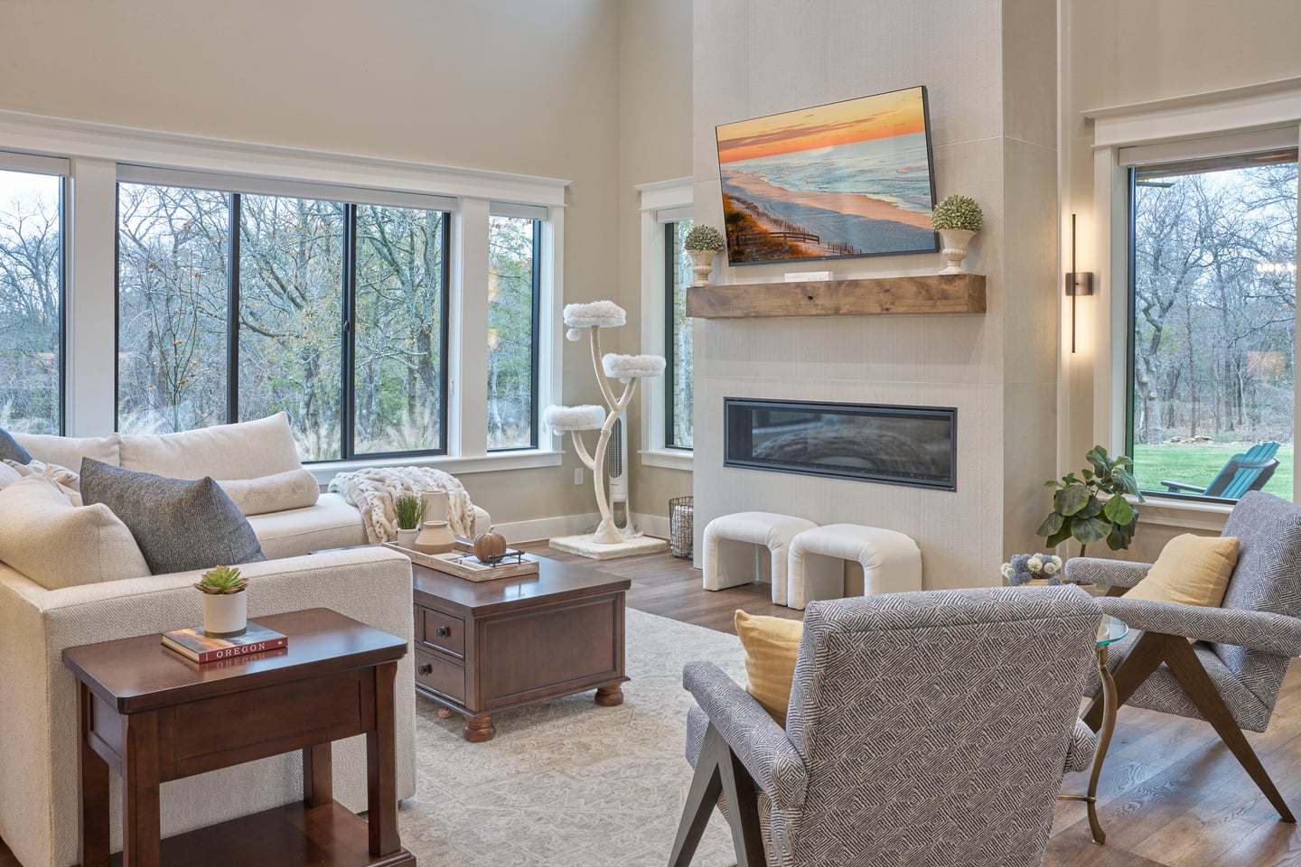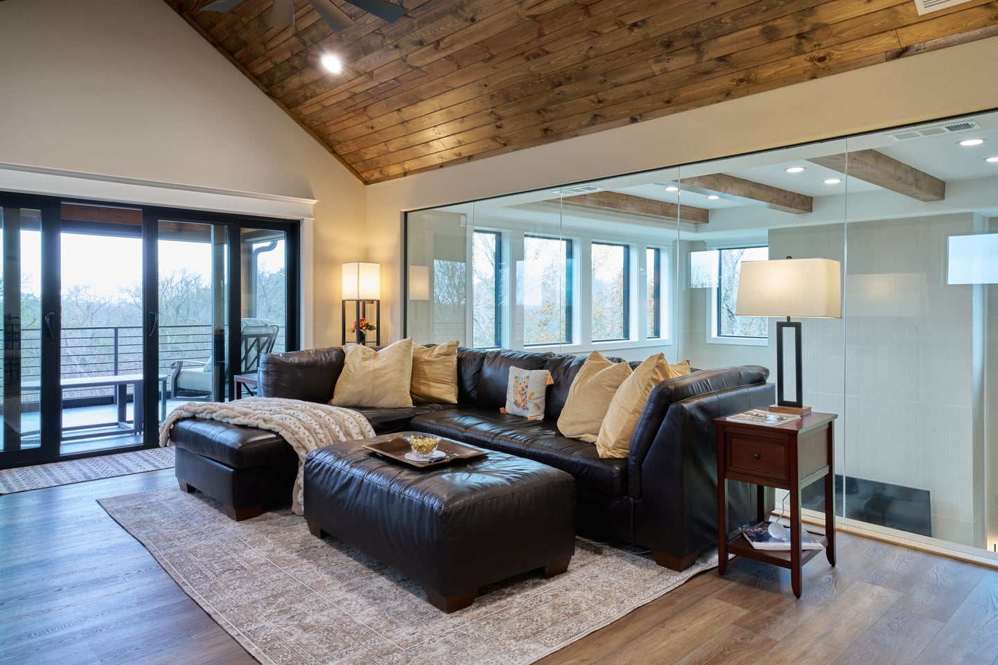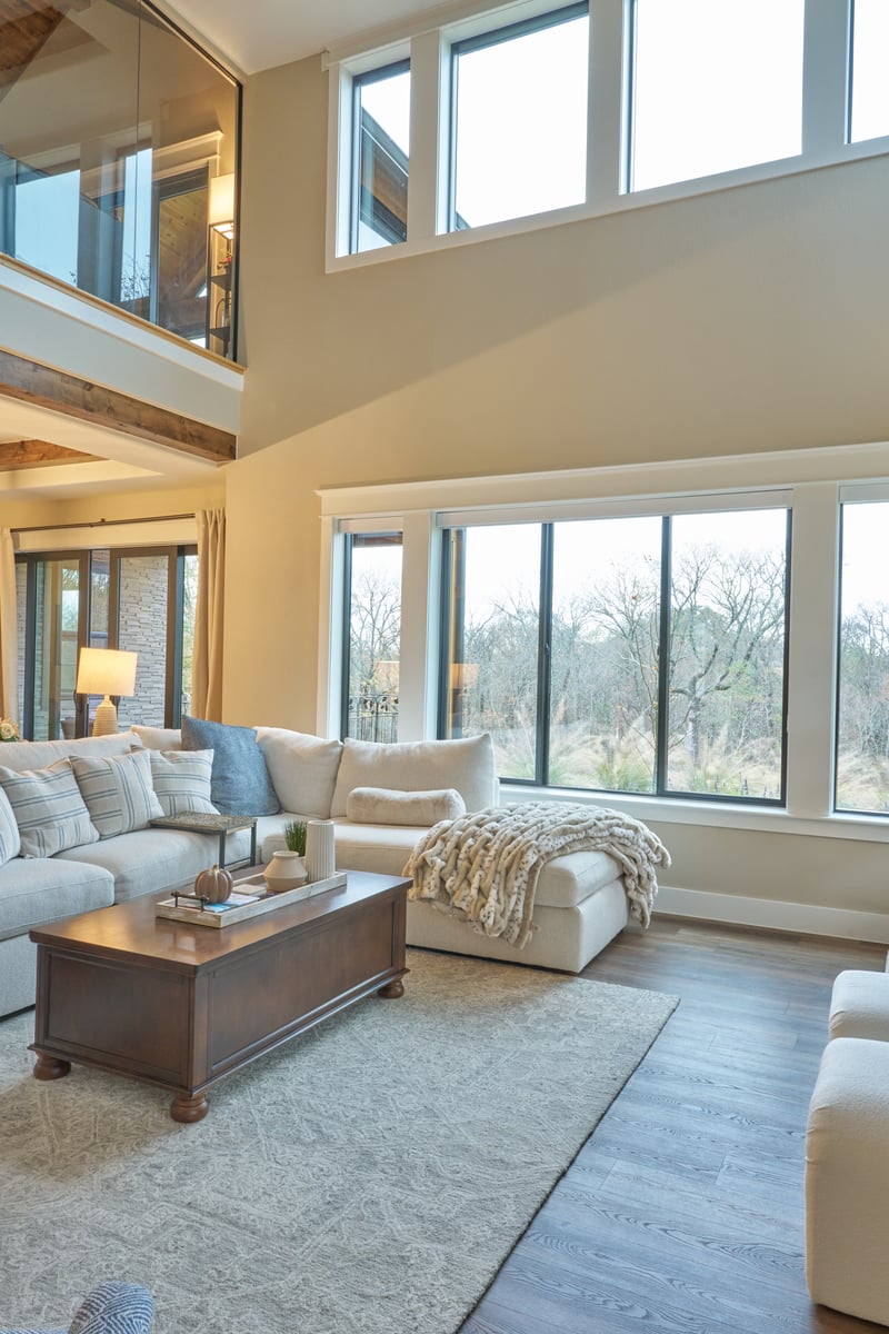 The living room captures everything the owners wanted. The ceiling rises through a full double height, crossed by exposed timber beams, with a glass-railed loft visible above — the upper-level game room, separated by glass walls so that people upstairs and down can see each other without combining their noise. Windows run floor to ceiling on two sides, filling the room with natural light that shifts through the day. The effect is a space that feels both expansive and warm — open to the sky and the trees, but grounded by the wood tones, the textured furnishings, and the soft palette that runs through the home.
