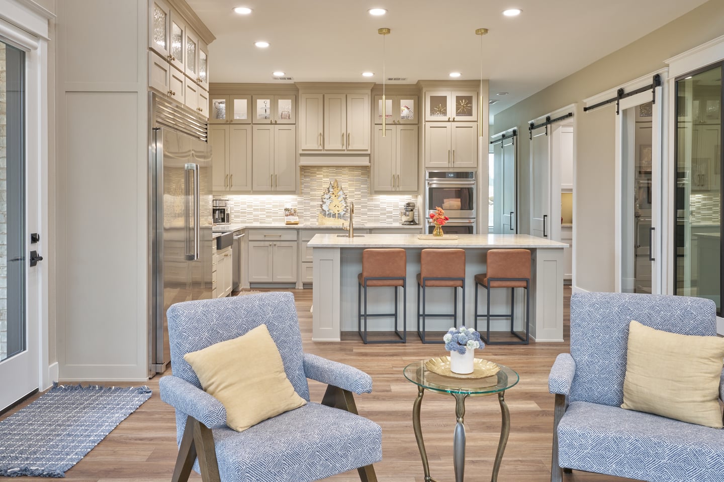 Heather and the wife worked closely together on a palette of subtle contrast — warm neutrals that shift from room to room without ever breaking. The countertop selection, which Roberth calls his favorite in any home the team has built, anchors the kitchen. The cabinetry, the backsplash, the leather seating, and the metal accents all participate in a composition that feels unified but never monotonous. The fireplace became Heather’s favorite detail: a large-format tile with a slight texture that catches light differently depending on where you stand.