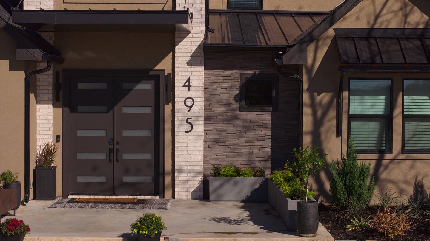 Five or six exterior materials — brick, stucco, stone, metal, and a three-dimensional textured tile — are woven together across the facade. The mix could have become chaotic. Instead, it produces a textural richness that draws everyone to this home: every surface has depth, every angle catches light differently.
