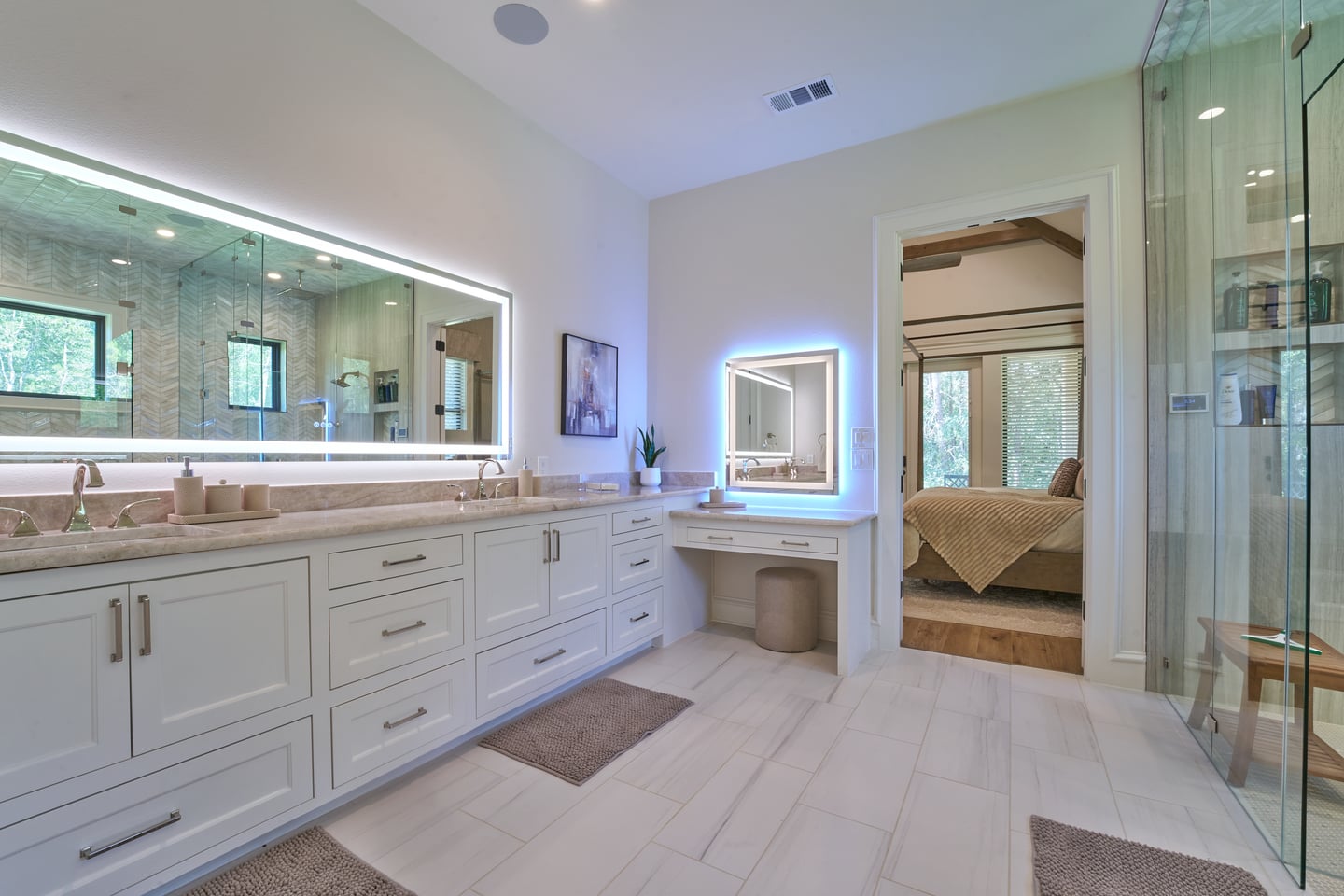 The master bathroom captures the level of craftsmanship that runs through the home: a glass-enclosed steam shower lined in chevron marble tile, with natural light entering through windows that frame the trees outside. It is a room where every material was chosen, placed, and verified — the process described throughout this site, visible in every surface.