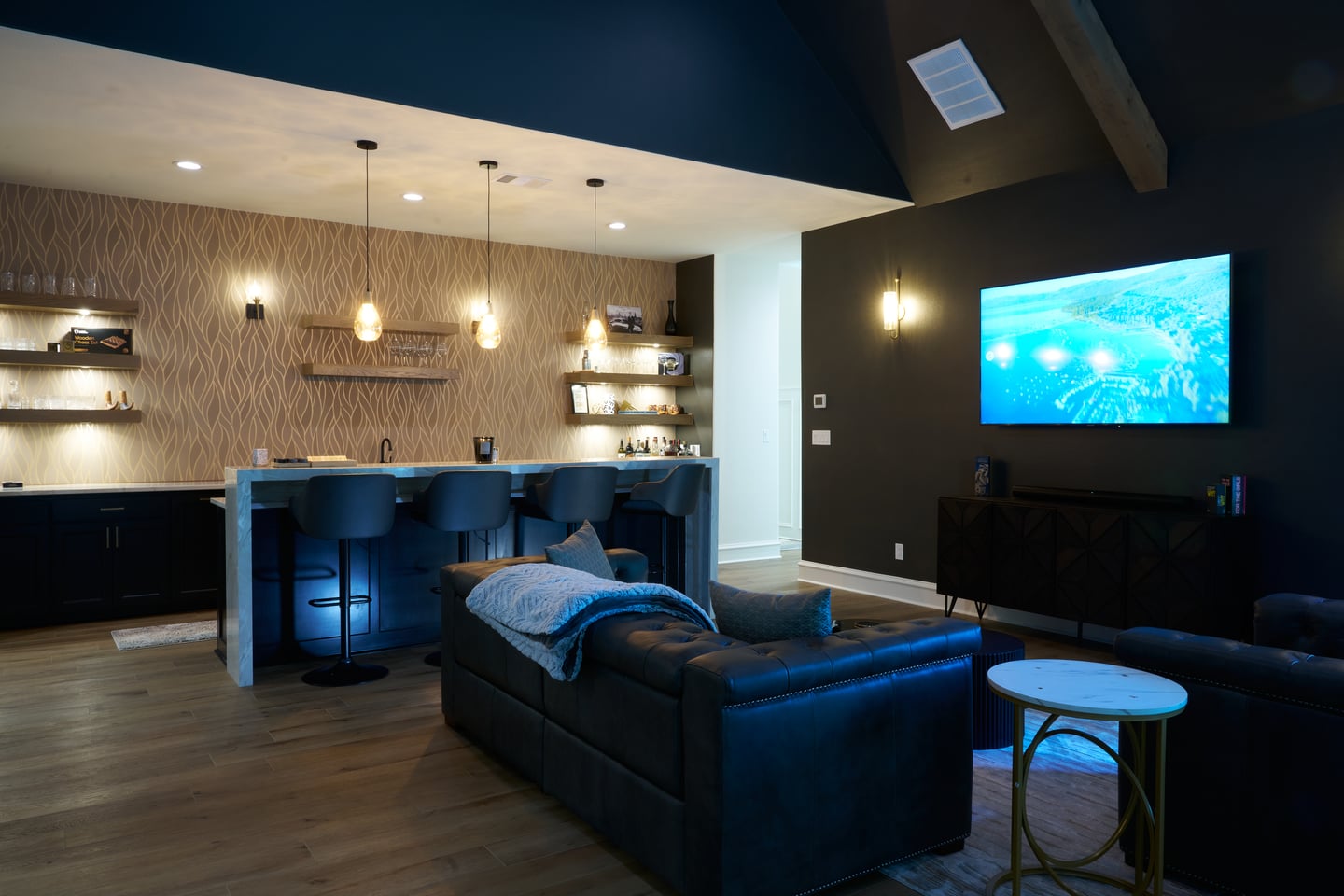 Their brief to the architect was two words: welcoming and grandiose. A lakehouse that felt generous in scale and warm in character. A home where the back patio, the living room, the kitchen, the bar, and the game room all connected to one unifying outdoor space so that no matter where you were, you were part of the gathering.